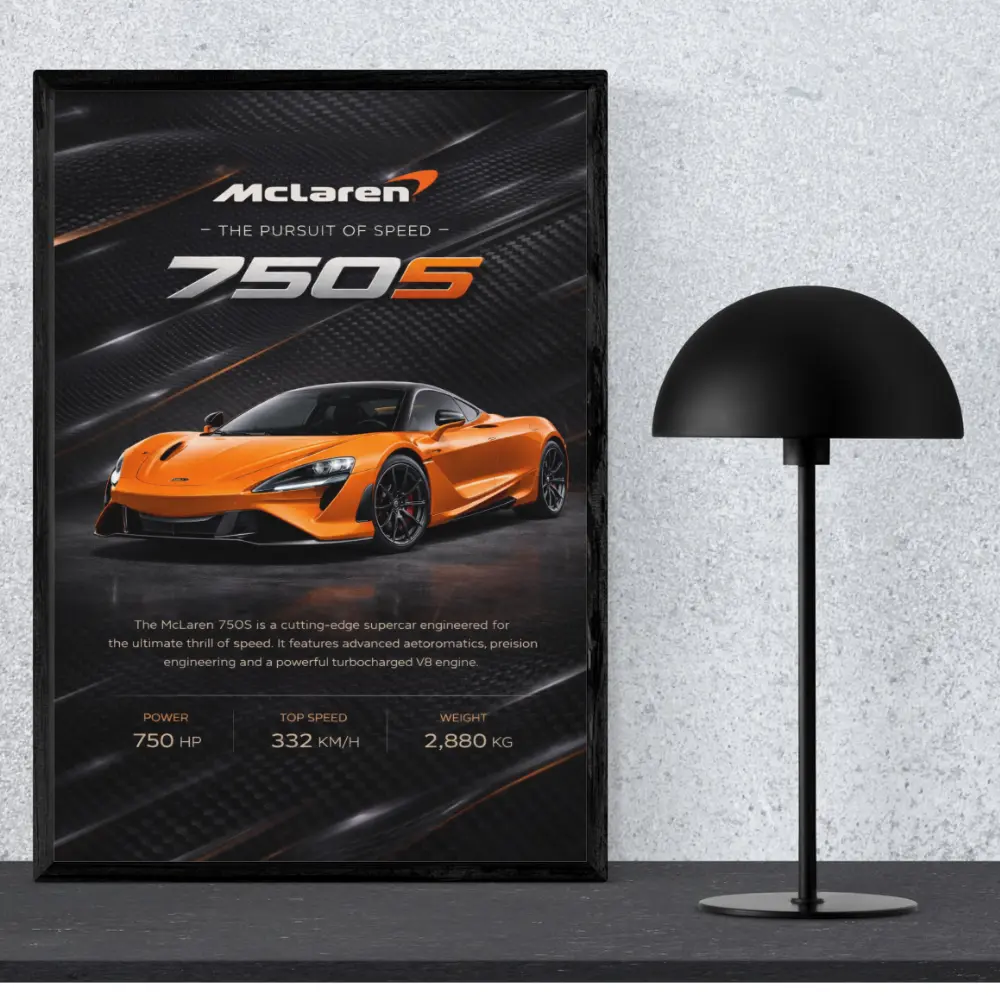 Rev up your space with this stunning McLaren 750S tribute poster. Featuring the iconic “Papaya Orange” supercar and detailed performance specs, this high-quality print is the ultimate statement piece for car enthusiasts and modern garages. Available in multiple sizes and premium materials. (No frame included).
