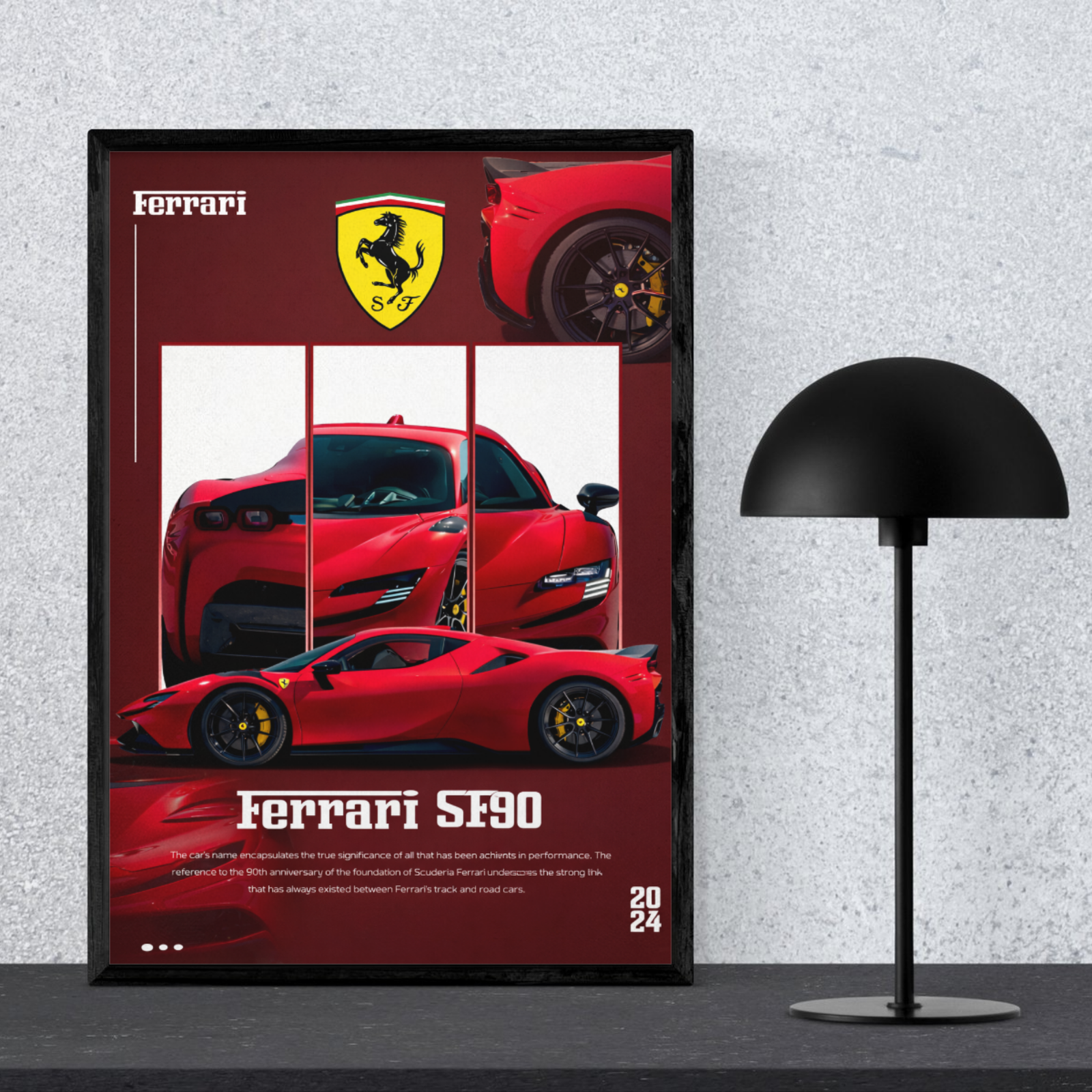 Bring the speed and elegance of Maranello into your home with our Ferrari SF90 Stradale A4 Wall Art. This stunning poster captures the aggressive lines and 90th-anniversary heritage of one of Ferrari’s most powerful hybrid supercars. Printed on premium heavy-weight paper with vivid color reproduction.