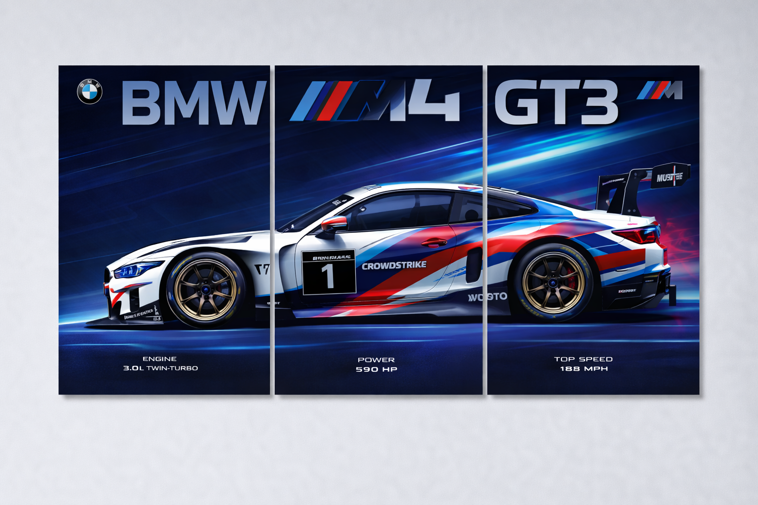 Rev up your interior decor with our premium 3-split poster set. This collection features iconic high-performance vehicles, including the track-ready BMW M4 GT3 and the , expertly divided across three vertical A4 panels. Each 1-side print captures every technical detail and sleek curve of these automotive legends.